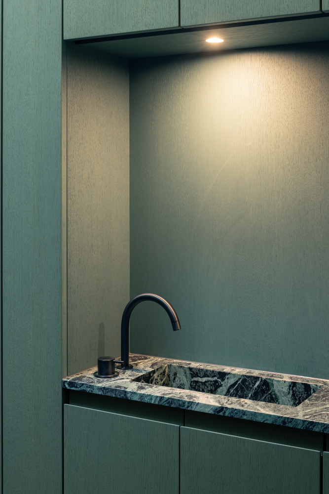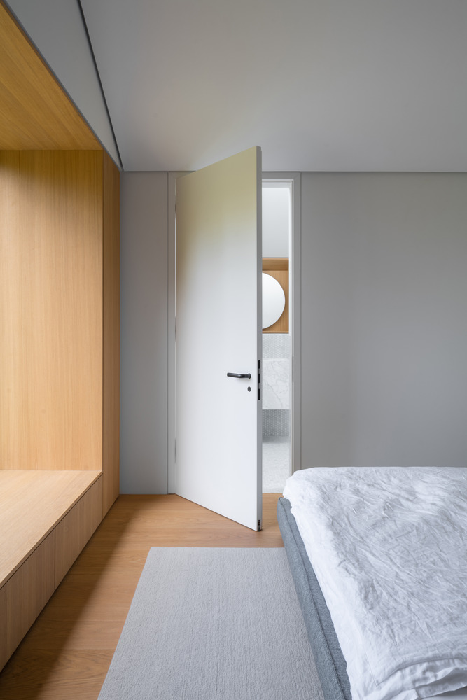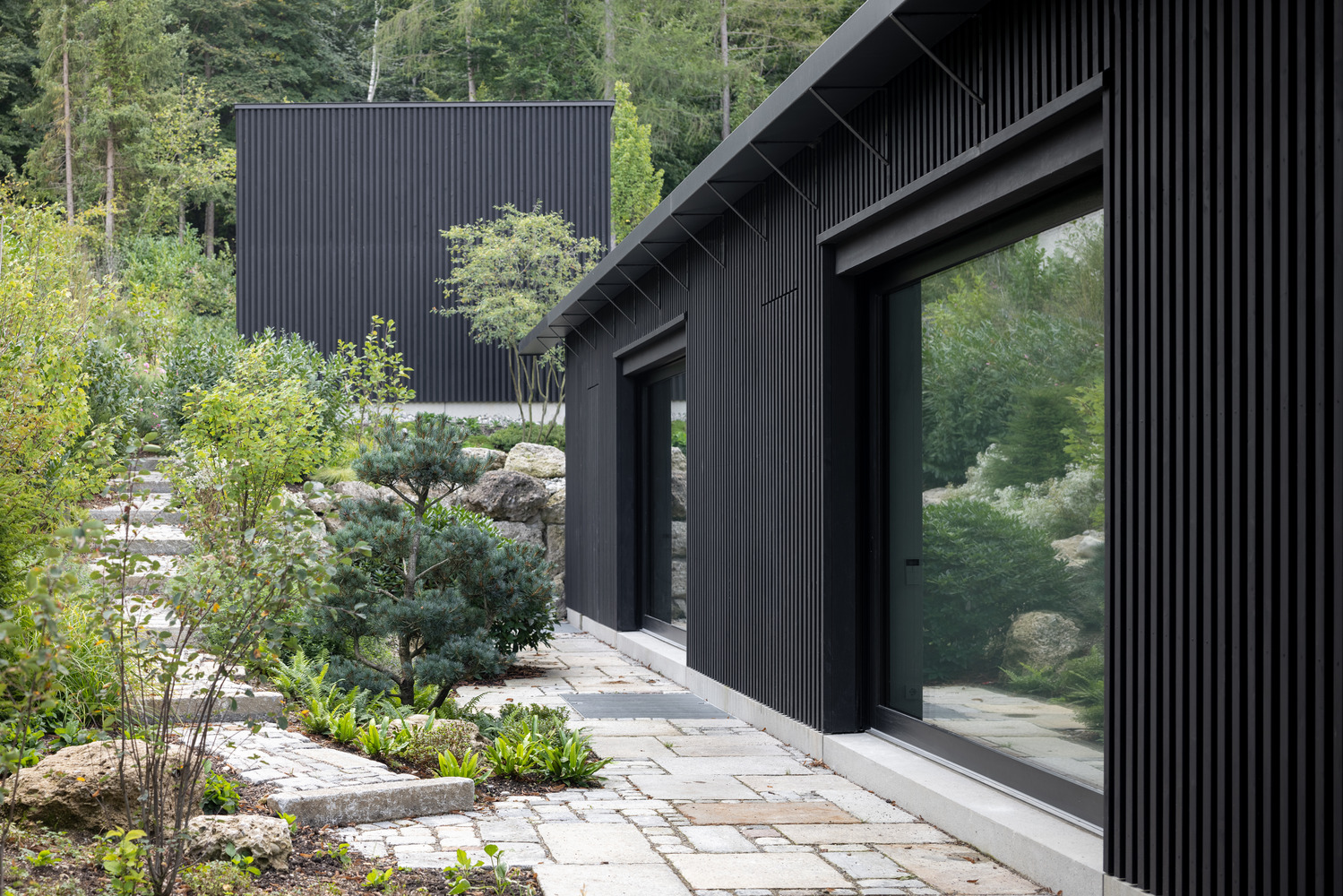 This family residence expresses its inner life, seasonal context, light, and surrounding environment through a simple architectural form. Conceptually, it distinguishes between private rooms and spacious open areas designed for daily family life. All private spaces are artistically composed of wooden cubic volumes, between which the open areas extend both horizontally and vertically—drawing light deep into the house, even in winter—and framing stunning views of the garden, treetops, and the lake beyond from every vantage point.