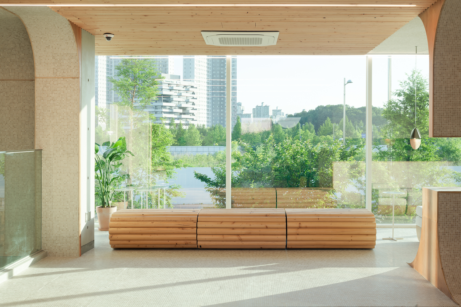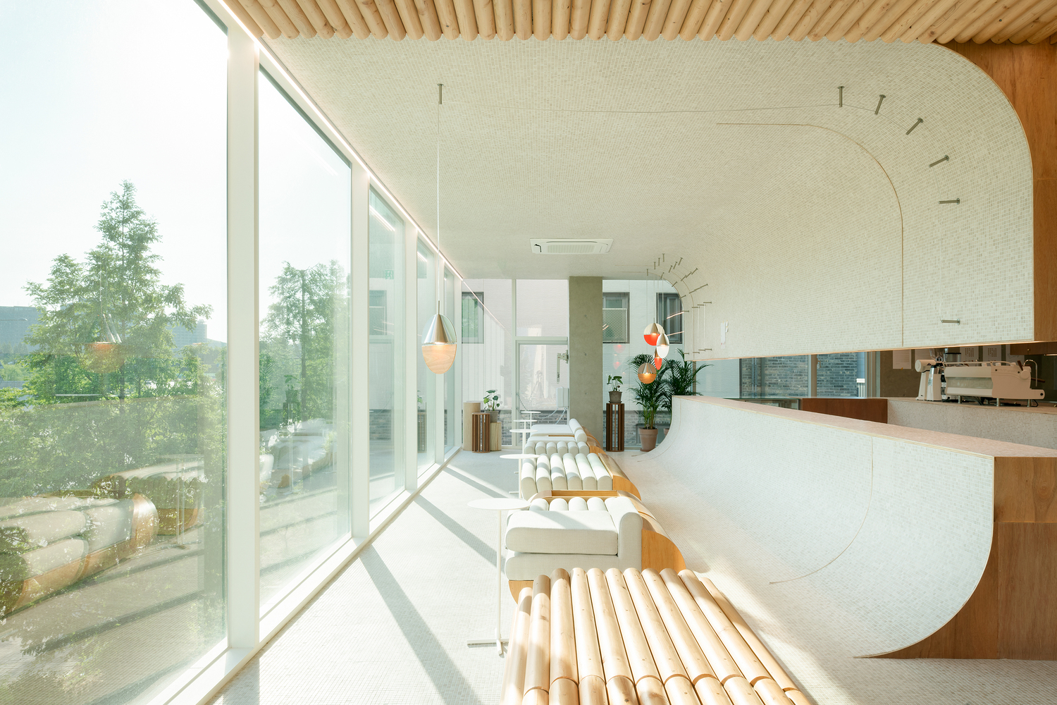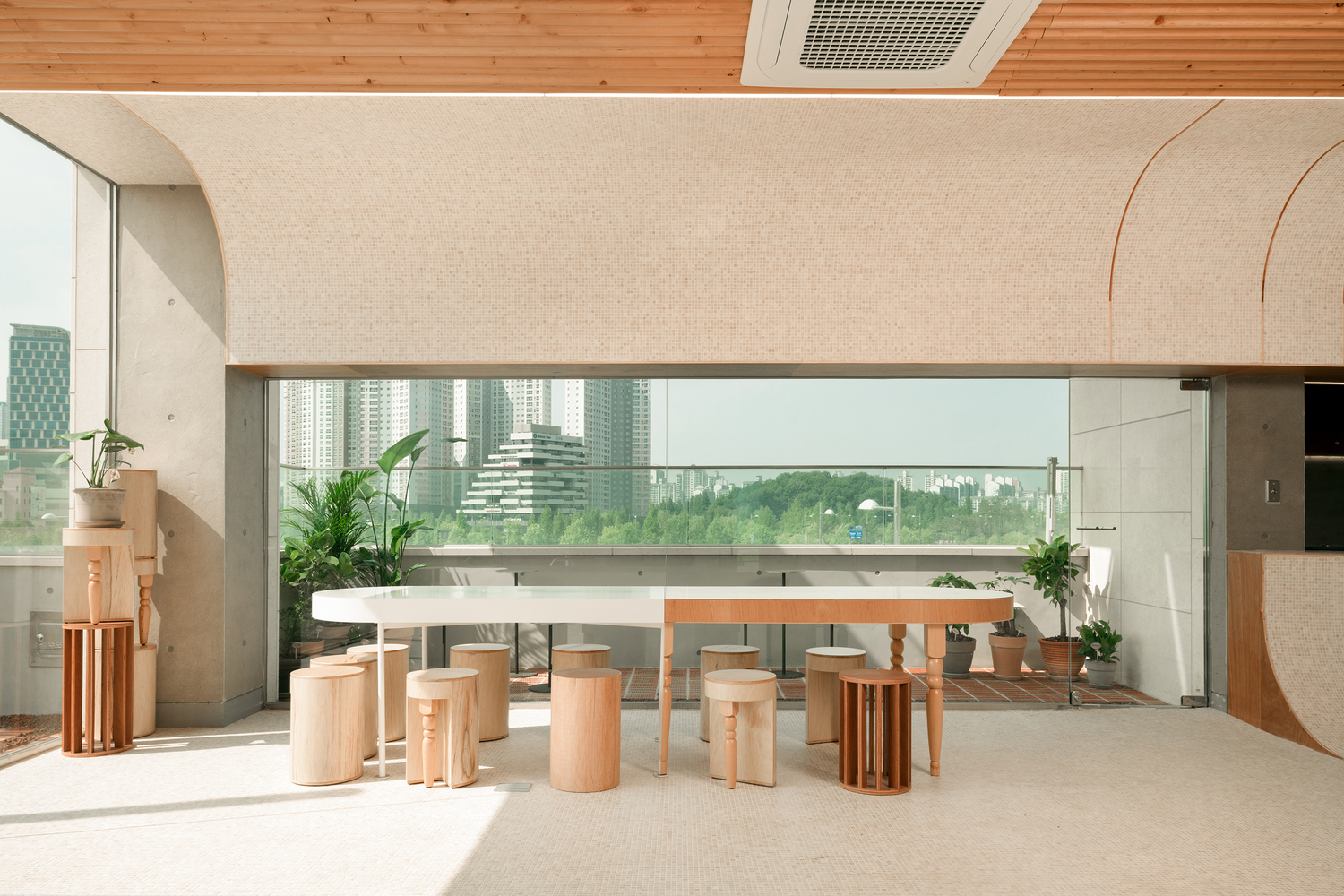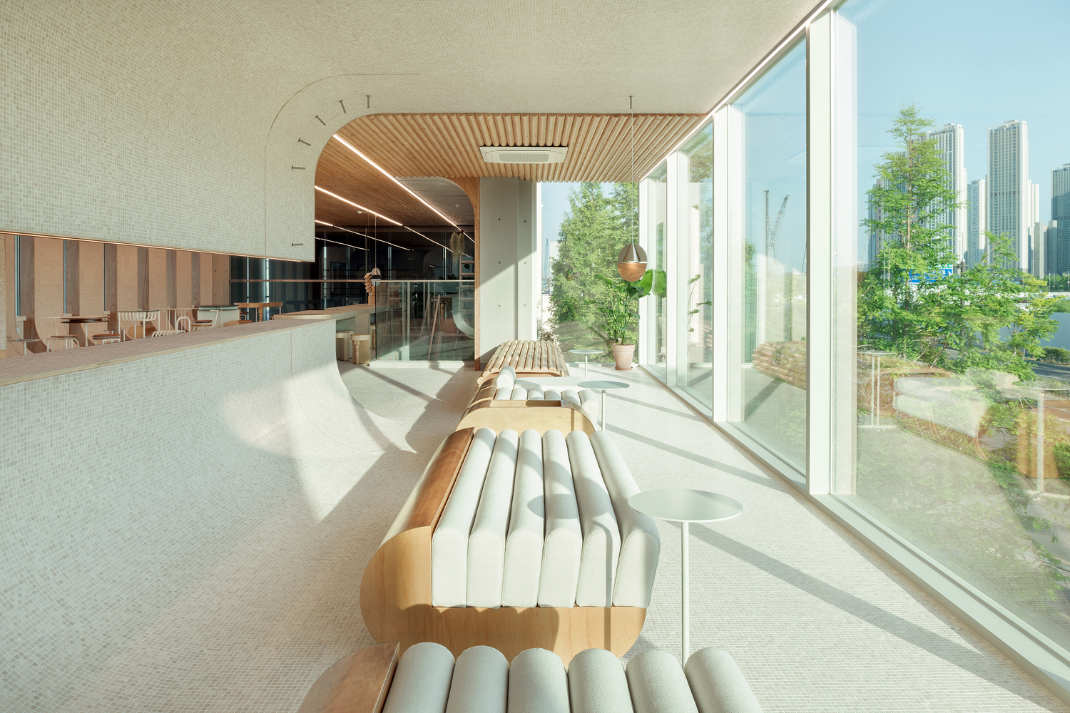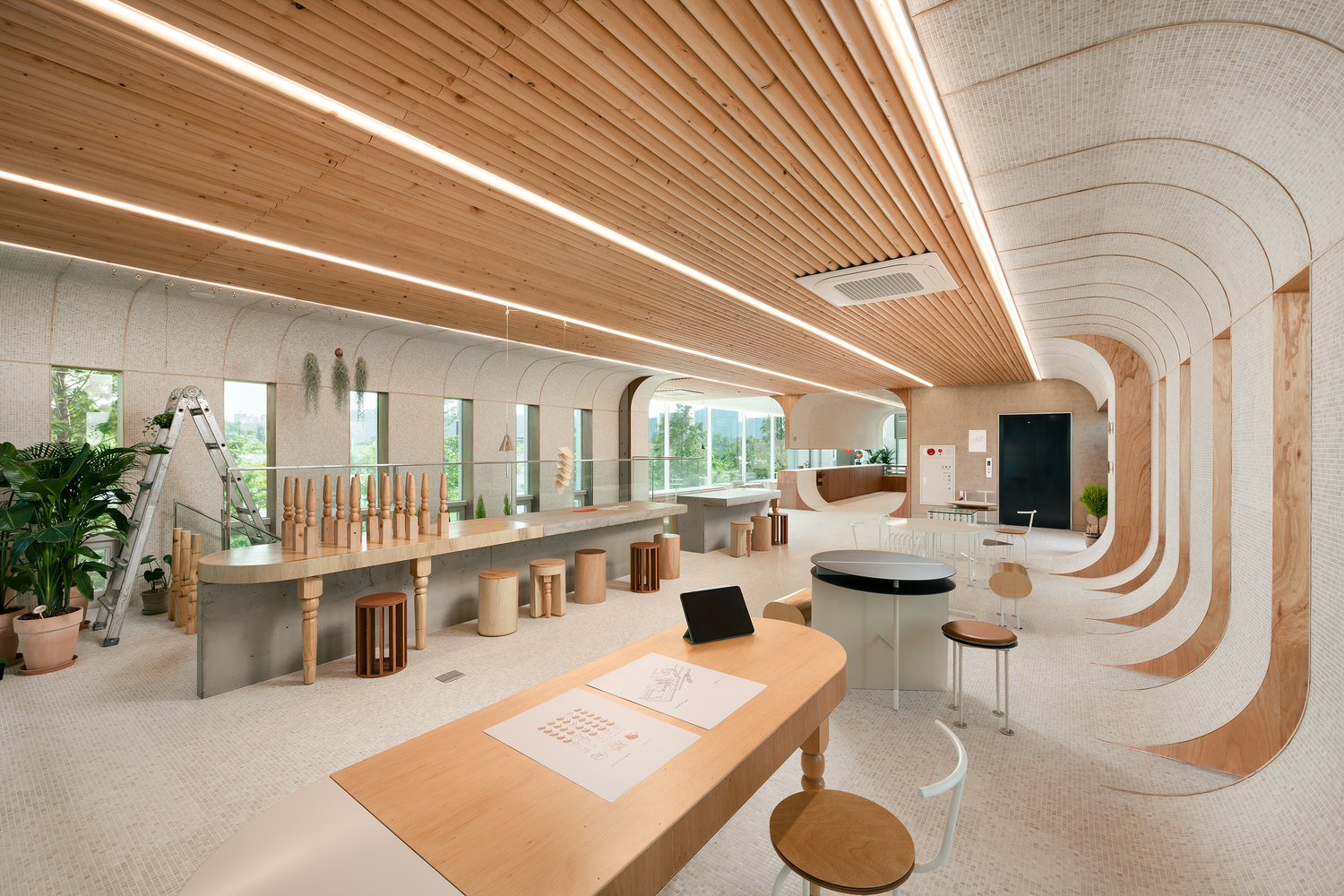 Furniture crafted with perfect curves—realized through concrete casting, wood integration, overlapping circular tubes, and other forms—seamlessly blends into the space. The design emphasizes the curved spatial layout rather than drawing attention to the materials themselves. Limestone, a natural stone commonly used in European square fountains, is cut into tiny 1.5mm x 1.5mm fragments, covering the room’s floors, walls, and ceiling. The corners of the interior are rounded into arcs (with a consistent radius of 600mm), blurring the boundaries of each side and creating an illusion of spatial expansion. The space even makes the main subject stand out with a sense of weightlessness.