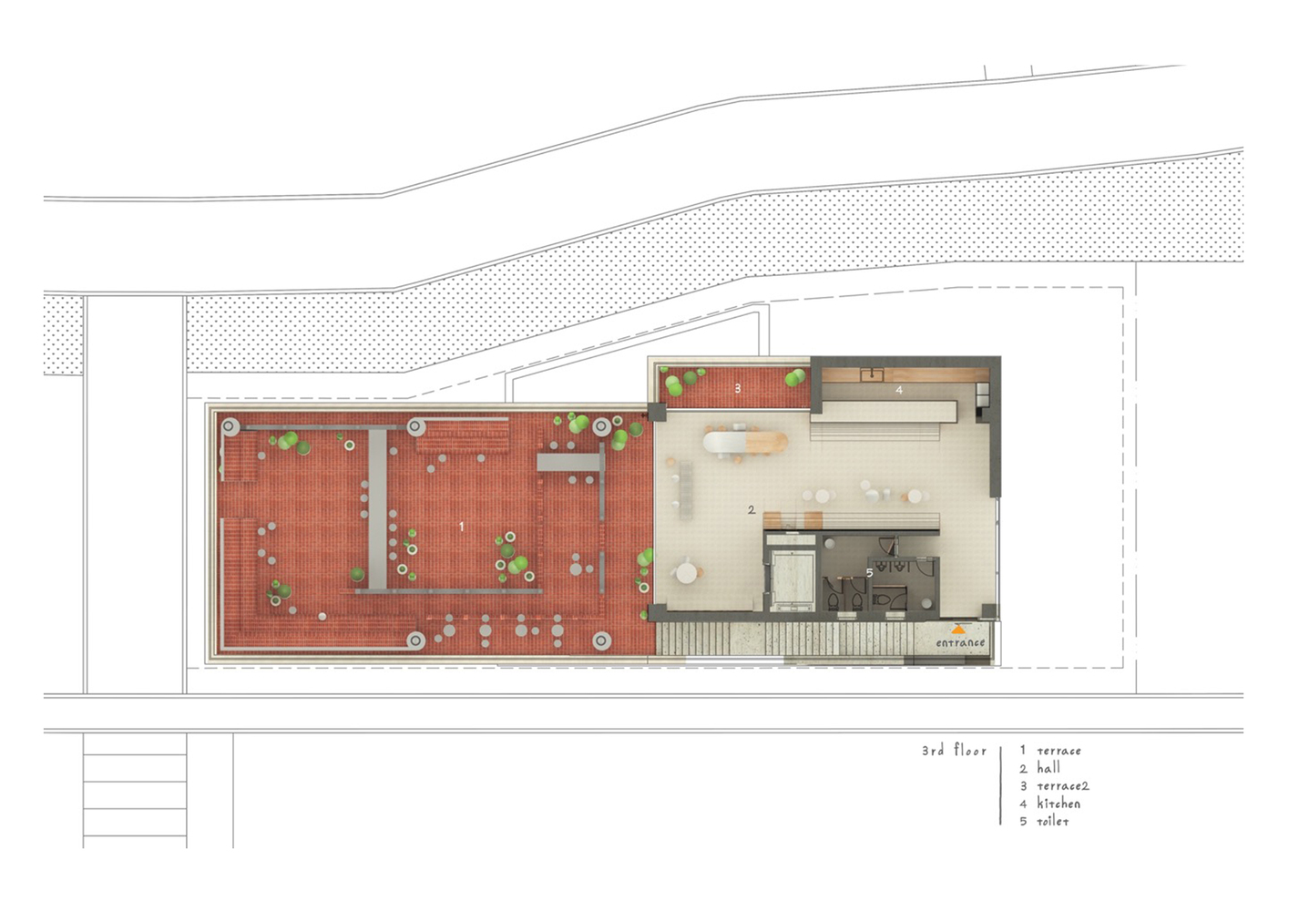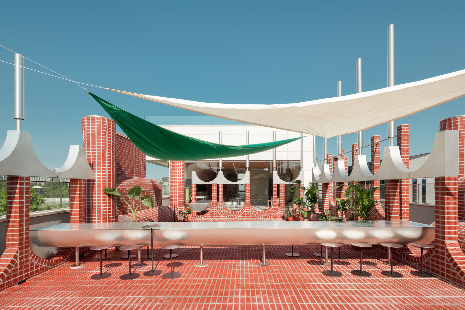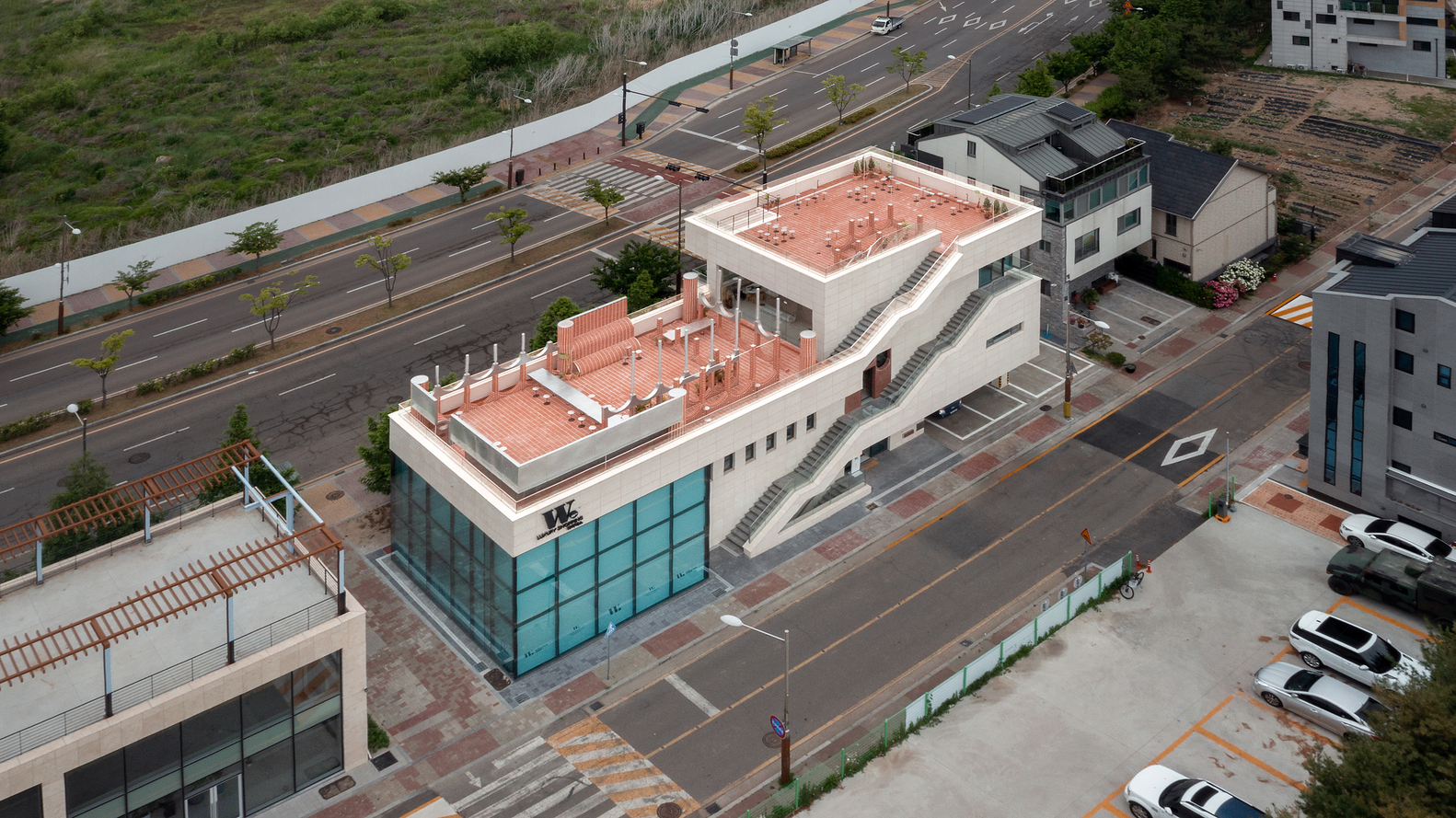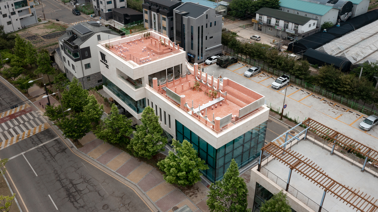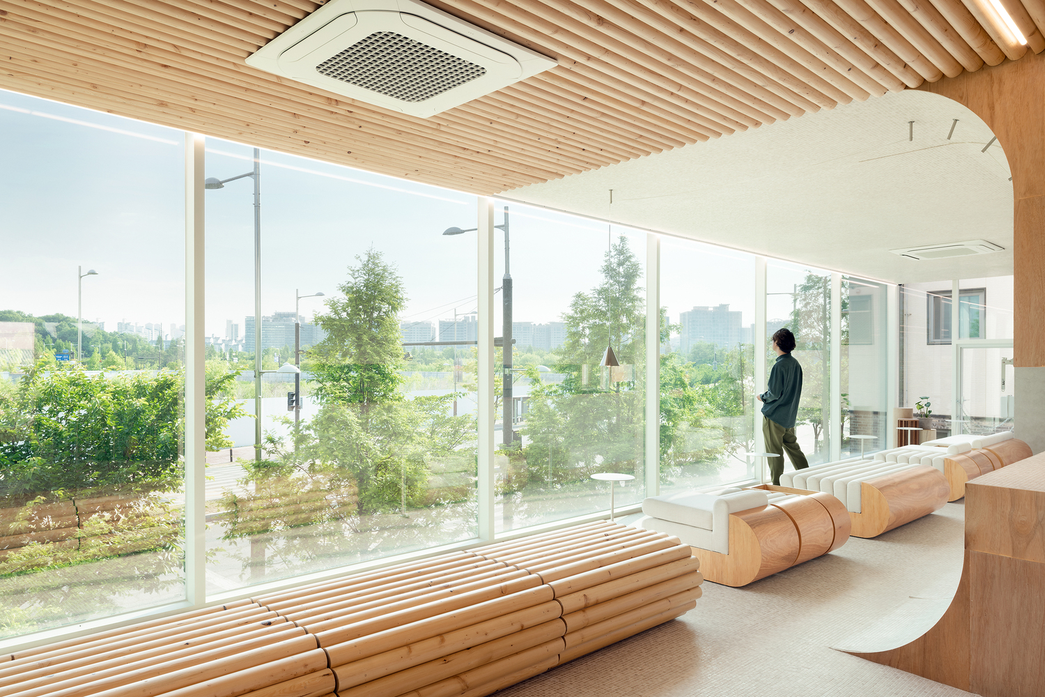 Furniture crafted with perfect curves—realized through concrete casting, wood integration, overlapping circular tubes, and other forms—seamlessly blends into the space. The design emphasizes the curved spatial layout rather than drawing attention to the materials themselves. Limestone, a natural stone commonly used in European square fountains, is cut into tiny 1.5mm x 1.5mm fragments, covering the room’s floors, walls, and ceiling. The corners of the interior are rounded into arcs (with a consistent radius of 600mm), blurring the boundaries of each side and creating an illusion of spatial expansion. The space even makes the main subject stand out with a sense of weightlessness.